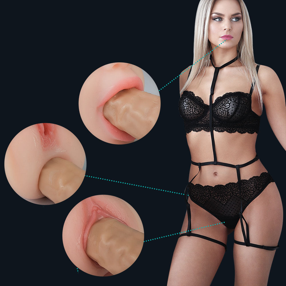 Haar vagina, anus én mond zijn voorzien van zorgvuldig ontworpen structuren die elke beweging versterken. Van zachte ribbels en drukpunten tot een warme, strakke pasvorm. Het voelt alsof je diep in een echt lichaam zit. Zelfs haar mond is uitgerust met een tong, gehemelte en zachte tanden voor een verbluffend realistische blowjob-ervaring.