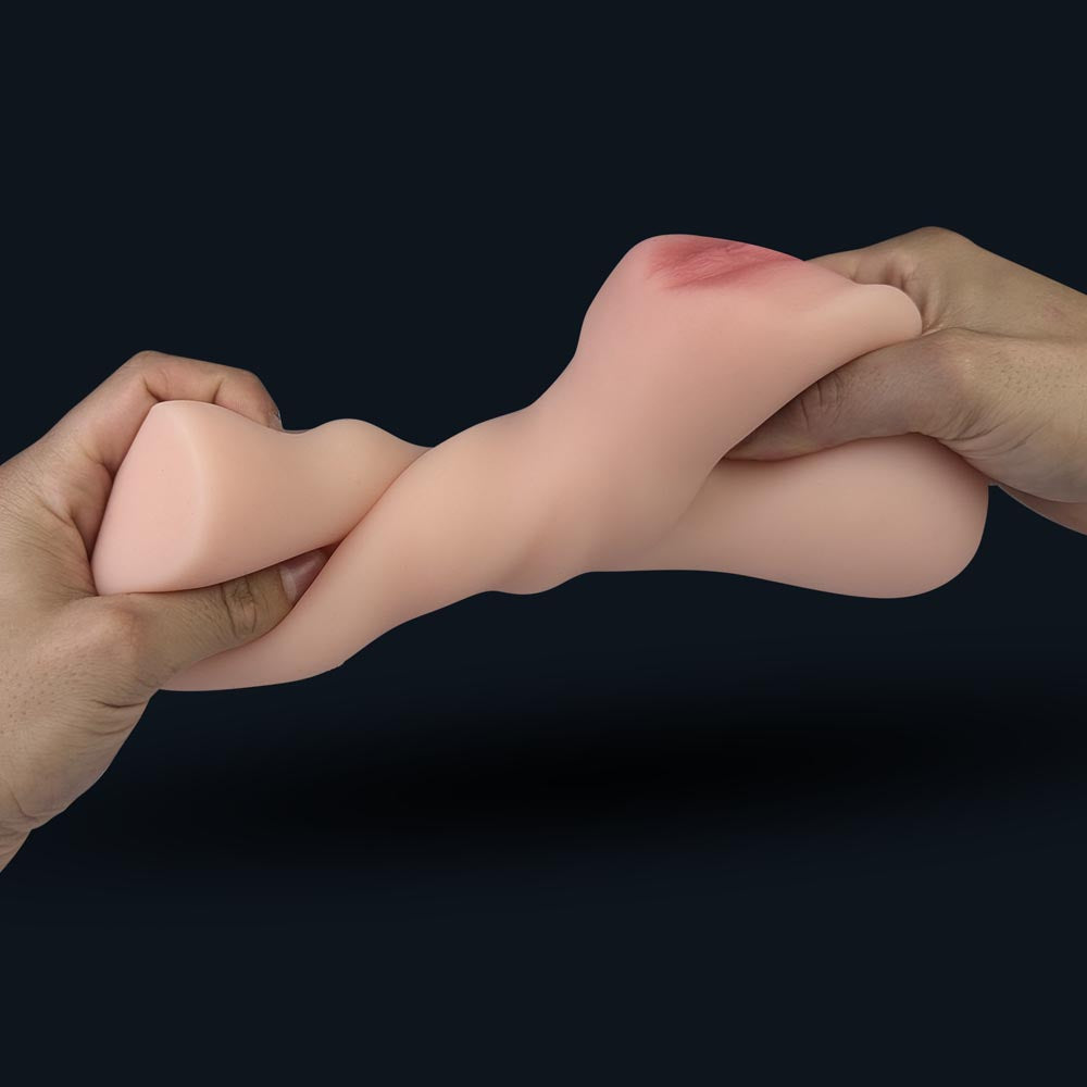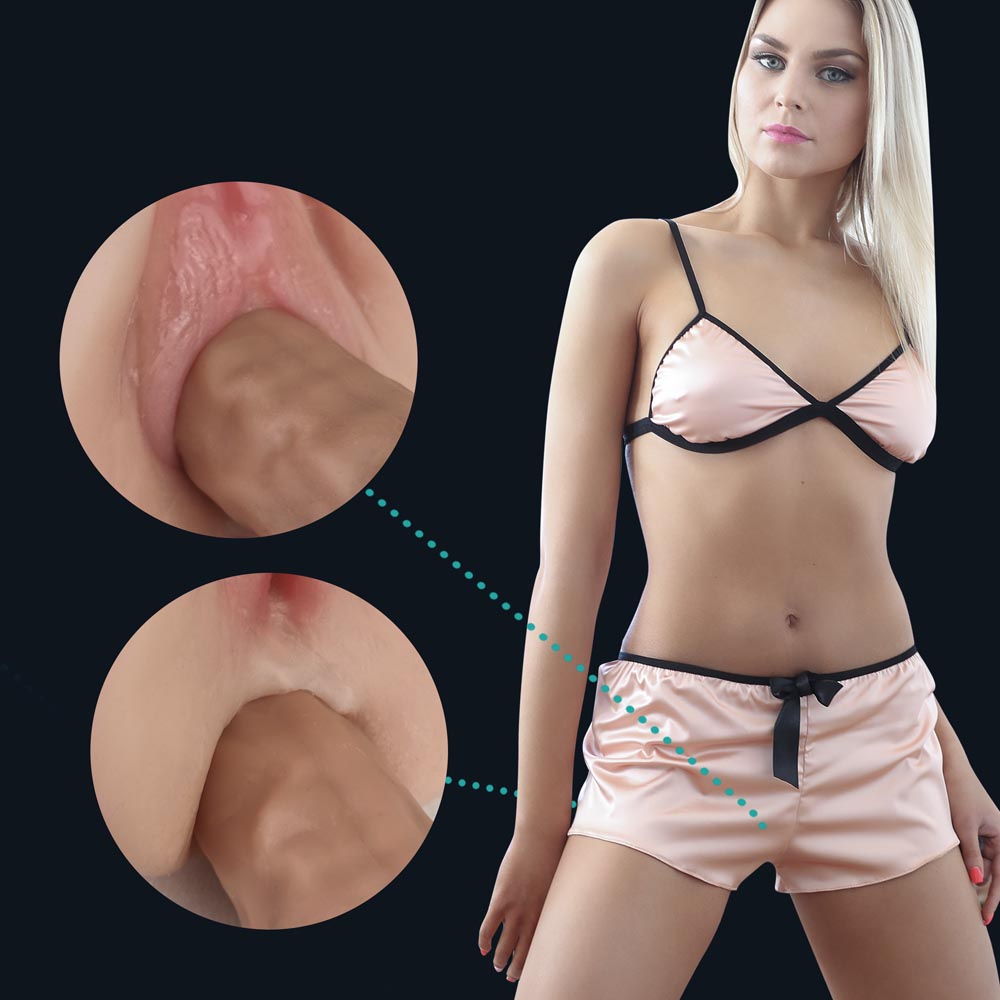 Haar vagina en anus zijn voorzien van zorgvuldig ontworpen structuren die elke beweging versterken. Van zachte ribbels en drukpunten tot een warme, strakke pasvorm. Het voelt alsof je diep in een echt lichaam zit.